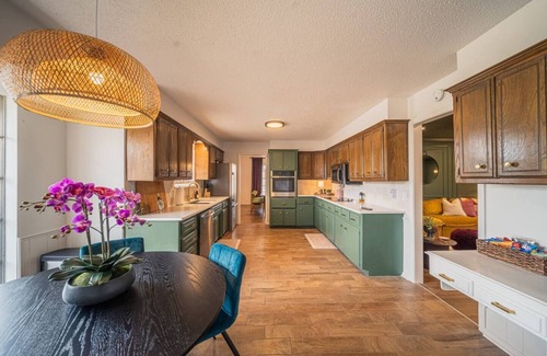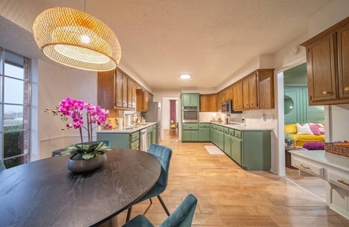 Immerse yourself in modern luxury at this designer 4-bedroom home, featuring striking architecture, premium furnishings, and a sleek design. Located in North OKC - 20 minutes from downtown, a few minutes from many local restaurants, shopping and attractions. This immaculate space is ideal for families passing through town, business groups, and groups looking for a touch of elegance during their stay.