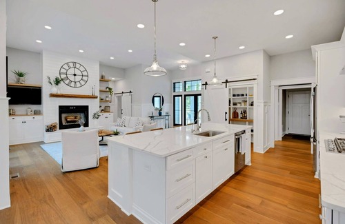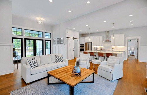 The open concept floor plan of Owls Nest really lends itself to entertaining and relaxing with family and friends. The great room, kitchen and dining area is surrounded by 12 foot ceilings and huge transomed windows all around, which brings the outdoors in! The great room has a huge white shiplap fireplace with custom cabinetry, hardwood flooring and sliders opening to the patio, hot-tub, grilling and fire-pit area. The kitchen has high-end stainless appliances, white quartz counters, a walk-in pantry and a breakfast/dining room with a huge Restoration Hardware country dining table, surrounded by windows. This gourmet kitchen comes fully stocked!