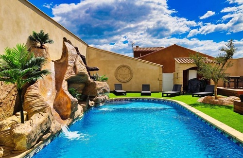 New 4P villa with pool, water slide and waterfall is located in Bessan. New 4P villa with pool, water slide and waterfall provides accommodation, featuring Parking, TV, Fireplace/Heating, among other amenities. This House features Parking, TV, Fireplace/Heating, to make your stay a comfortable one.
