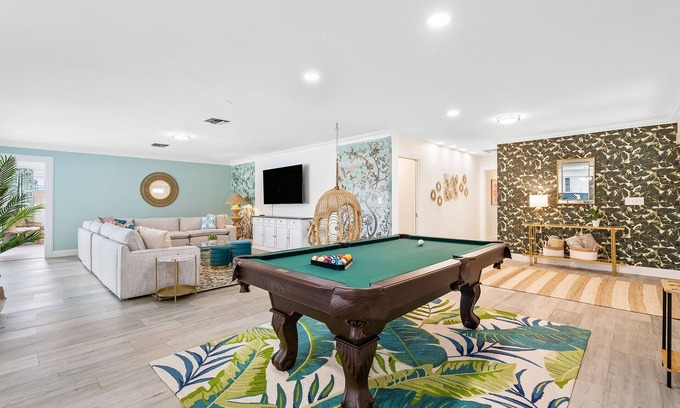 ☀ Open living room with lots of comfy seating, smart TV, & pool table