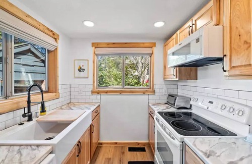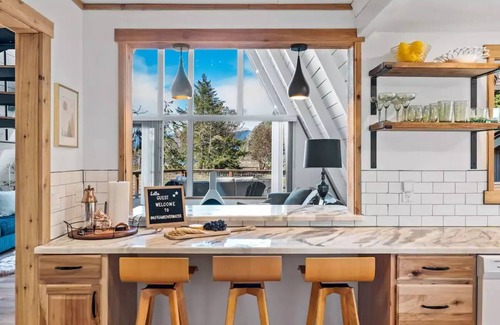 Please keep in mind that bedroom 3 is a cozy open loft space in the peak of the A-Frame above the 2nd floor bedroom. It has a window, a book shelf and a queen sized floor mattress as well as lighting and outlets should you decide to sleep up there. It is accessed by a built in rolling-style ladder. Please keep any safety concerns in mind when planning your stay.
