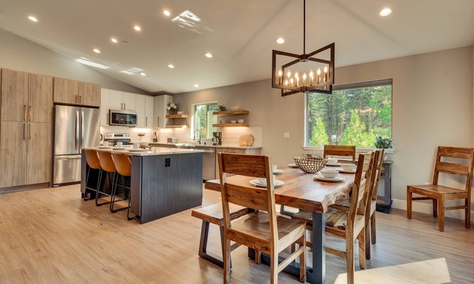 Step inside to find a warm and welcoming living space that invites you to unwind. The open-concept layout features a spacious living area with plush sofas, a cozy fireplace, and large windows that flood the space with natural light. The fully equipped kitchen boasts modern appliances and ample counter space, making it easy to prepare delicious meals for your group. Gather around the dining table, where you can share stories of the day's adventures over a home-cooked meal, or take advantage of the outdoor patio for an alfresco dining experience surrounded by the beauty of nature.