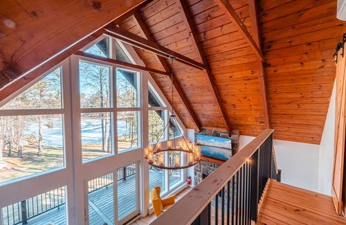 The loft space is a spacious master bedroom with vaulted ceilings, its own bathroom, a queen size bed and two twin beds. Its double barn doors open up to the amazing view of the lake.