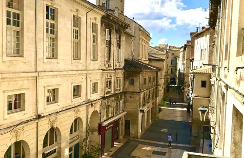 The apartment's balcony overlooks the rue du vieux Sextier and the Halles d'Avignon market. Located on Place Jérusalem, next to Place Carnot, Place Pie and Rue du vieux Sextier, this apartment offers quick, easy access to a wide range of shops, cafés, restaurants, museums, theaters and shopping. The lively neighborhood can be noisy, depending on what's going on at the time. Step out of the building onto the pedestrian street. The area is very popular with locals and tourists alike, so we'd be delighted to share our favorites! and our good addresses!