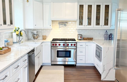 Watch gorgeous sunrises & sunsets from any of the 3 decks of this new construction (2022) Bayfront Avalon home. 3 well-appointed bedrooms with en-suite bathrooms, plus a half-bath, are decorated with coastal charm. The chef’s kitchen features Sub-Zero and Wolf appliances. Relax with Serena & Lily furniture, coastal decor & Sonos sound inside and on each deck while dining al fresco or sunbathing. Outside, enjoy the Weber grill, firepit, Jacuzzi, outdoor TV, or ride bikes through town.