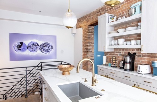 Kitchen: Sure, eating at the finest restaurants can be fun. But sometimes we all need a home cooked meal, right? That's why our well-appointed kitchen features pendant lights, cabinetry, and an exposed brick wall, creating a vibrant atmosphere. Enjoy the convenience of a "coffee bar" and wine refrigerator, along with ample storage space for kitchen essentials.