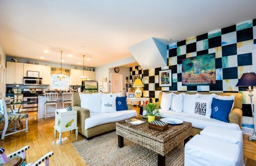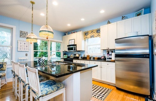 The main floor features one bedroom with a queen bed with an en suite full bathroom. Fully stocked kitchen with island seating for four as well as two more on a small round. Quaint family room with TV as well as outdoor screened-in porch dining. Second floor has three bedrooms, two with queens and one with three twins, as well as a full bathroom too. Lovely upstairs seating space as well to unwind with your favorite book!