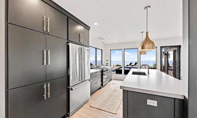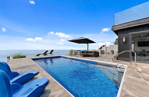 Contemporary 3 bedroom, 2.5 bath home with stunning views of Lake Michigan, a new lakefront saltwater pool and hot tub! This place has everything you could possibly need for your perfect vacation - open kitchen layout, living and dining area, and fireplace all open to the lake view. Master bed and more living space upstairs overlooking the lake. Walk to downtown New Buffalo beach, harbor and restaurants - close to everything but feels like a private oasis where the lake meets the sky.