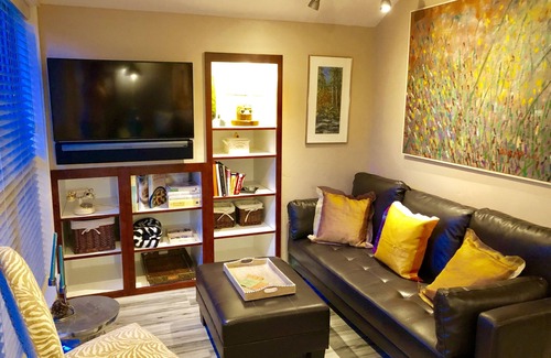 Our Chalet is located above our Garage @ the back of the Home. Privet entrance from privet deck, up the outside stairs at the back of home.