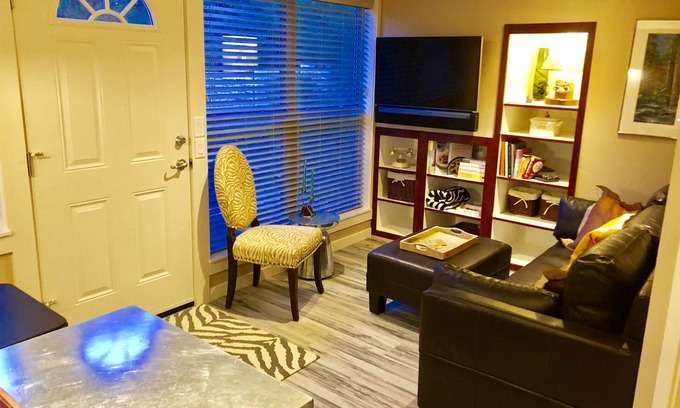 The Chalet is at the backChalet off main home, with fully equipped kitchen with fridge, stove, oven, cooking utensils, and dinning wares. It is a one bedroom and one bathroom property that can accommodate up to 6 people. Has three clean beds. With Queen-Queen bunk bed and separate bath. Has entry from inside home, as the outside entrance is still under construction. The unit is New construction. Very Modern, with smart TV & music and lights.