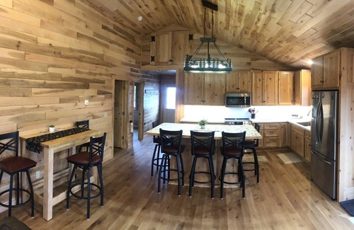 Sitting on the property of Northwinds Adventures, a year round camp, the “Perch" cabin features 3 bedrooms; one with a King bed (linens provided), one with a Queen bed (linens provided) and another with 2 twin bunks (linens provided). For additional sleeping space, there is a full futon and leather couch in the living room. Pack and Play available upon request - $10. White Oak hardwood floors throughout cabin and gorgeous maple walls and ceilings, both bathrooms have beautiful tiled walk in showers. A wood burning stove is available to take the chill off in the cooler seasons, firewood provided for $8/bundle. In the hot summer months enjoy the A/C. The kitchen is full with a large island, everything you need to prepare a great meal after a day outdoors. Washer/Dryer for use as well!