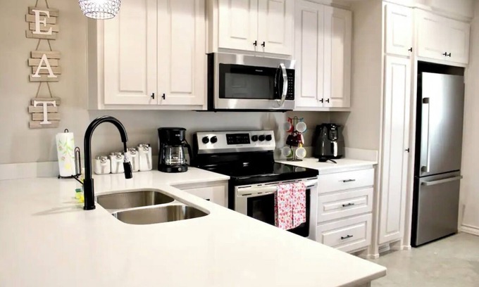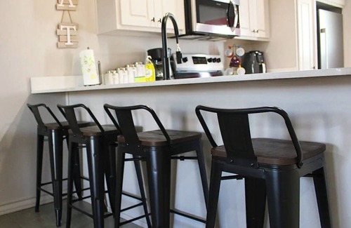 This modern townhome is nestled right on the Concho River with direct river access. The kitchen/living area offers an open floor plan complete with hi-speed internet, 55” TV, Roku for streaming, and a desk for designated workspace. Let’s not forget meal time! Our fully equipped kitchen comes with everything you need for home cooked or quick meals on the go. You will find it all, including air fryer, toaster, dinnerware, bakeware…you name it. Basic spices and condiments are also provided as well as some easy breakfast options and snacks. Washer and dryer are in the home so you don’t have to take home dirty laundry.