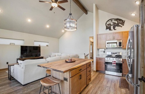 The main level has a master suite with a king bed and a full bathroom. Relax in the living room on the comfortable couch while enjoying the picturesque views, or your favorite movie. Make your morning cup of coffee at the coffee bar and enjoy drinking it on the front deck to the sunrise over Bryce Canyon. The kitchen is properly equipped with all of your cooking needs. We have a fridge/ freezer, oven, microwave, air fryer, crockpot, toaster, waffle maker, rice cooker, and more! We do not have a formal dining room. We have an outdoor dining table that seats 6 so you can enjoy your meals to the sights and sounds of the mountains. We have 2 barstools and a table in front of the window in the living room so you can enjoy your meals with views of Bryce Canyon. There are 5 additional barstools around the kitchen island.