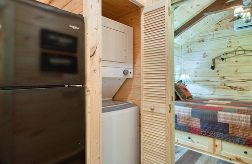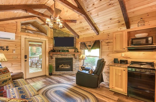 A 1 bedroom (queen size bed) and 1 bath cabin located in beautiful Maggie Valley, NC, on a creek, screened room, Wi-Fi, dish tv (2 tv's, living room and bedroom), fully stocked kitchen, grill, fire pit, and chairs to enjoy on the deck. Washer and Dryer. Queen Sleep Sofa in living room. All the comforts of home.