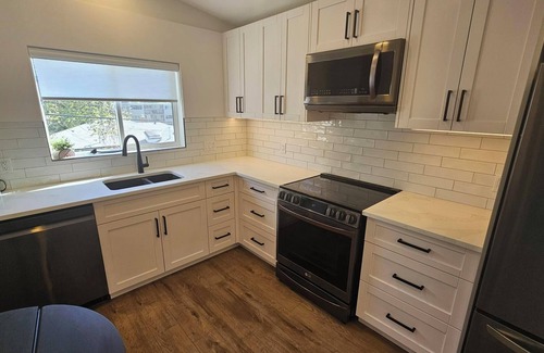 Full kitchen with stove, oven, fridge, microwave & dishwasher