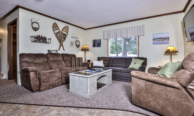 The Otter Lodge Living Room features a 47" TV with DirecTV satellite programming, a recliner, a reclining sofa, and a sleeper sofa. The kitchen offers a refrigerator, stove, microwave, coffee maker, toaster, dishes, pots, pans, and utensils. Bedding is provided, but you provide your own towels. ADDED VALUE – We have a cell booster and unlimited wifi in this home!