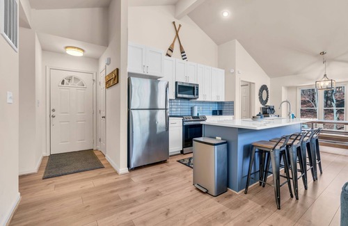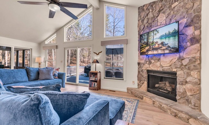 Everyone will love the spacious main living area, highlighted by a soaring pentagon-shaped wooden ceiling and a grand stone fireplace. Cozy gathering spots abound, with a wall-mounted flat-screen TV perfectly positioned in front of comfortable sofas—ideal for unwinding after a day of fun. The updated, modern kitchen boasts a full suite of stainless steel appliances, along with all the essential kitchenware and gadgets a chef needs to prepare a feast. When it's time to dine, guests can gather around two separate tables—one granite island seating six and another table seating four. Just off the dining room/library, a screened-in porch with ample seating offers a serene lake view, making it the perfect spot for morning coffee or a sunset drink.