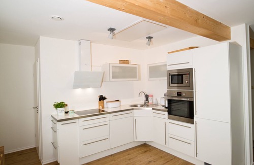 On the upper floor there is the approximately 50 m² modern and comfortably designed living-dining area with leather couch, wood stove, cozy dining area and direct access to the spacious terrace and the garden. Fully equipped kitchen with fully automatic Jura coffee machine, induction cooker, oven, microwave, dishwasher, refrigerator and separate freezer. Toaster, kettle, hand blender, blender / smoothie maker and raclette grill are also available. The bedroom is furnished with a large double bed (180x200) at a comfortable height and 7 zones of cold foam mattresses as well as a spacious wardrobe. Bathroom with shower, toilet, hair dryer.