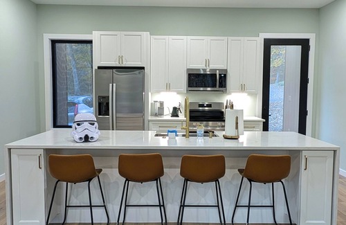 Cook, laugh, and connect around our stunning 10-foot quartz waterfall island. Fully stocked with modern appliances, cookware, and a Keurig coffee maker, it’s a chef’s paradise—or the perfect spot to enjoy takeout!