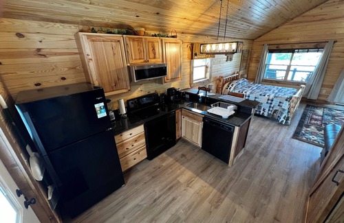 Couples searching for a romantic escape will adore our newly constructed one-bedroom log cabin. The open floor plan includes a majestic stone fireplace, a queen-size log bed with a luxurious foam mattress, a full kitchen with all major appliances, and a spacious full bathroom. French doors in the cabin allow you to wake up to breathtaking mountain views right from your bed.