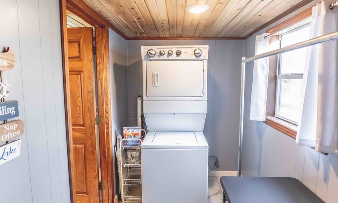 All of the bedrooms have comfortable plush beds and bedding, large closets and fun lake decor. Located at the front of the home on the main floor, the Master Bedroom has a private entrance from the front patio. It has a King bed, large closet setup and smart TV; Bedroom Two located in the middle back of the house on the main floor has a twin/full bunkbed w smart TV. Bedroom Three, located on the upper level of the home, features two Queen beds and one twin bed, two large closets and smart TV. Plus, the added bonus of a table for playing games. This bedroom also has a private entrance on the side of the house.