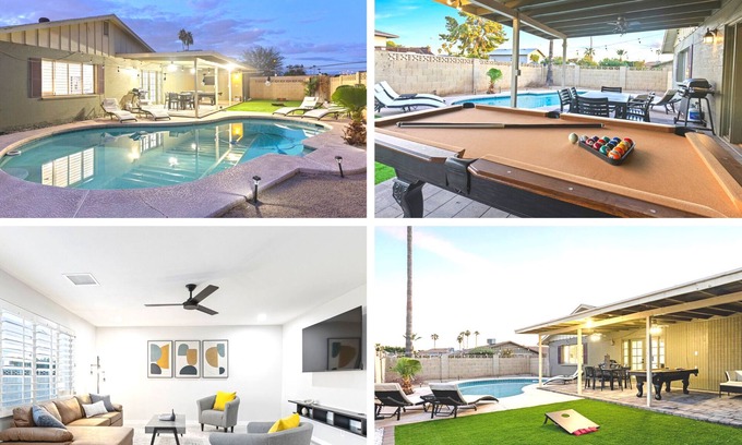 Unique Home Getaways brings the ultimate fun, Tempe retreat. Minutes away from ASU and a quick Uber to Old Town Scottsdale, this 4 bedroom 2 bath home is full of activities, a private pool, BBQ, pool table, and close many events. After a day full of golfing, shopping or hiking, take a refreshing dive into the private pool or have a barbecue while watching your favorite sports game on the outdoor TV. Also just minutes from freeway access + the airport.