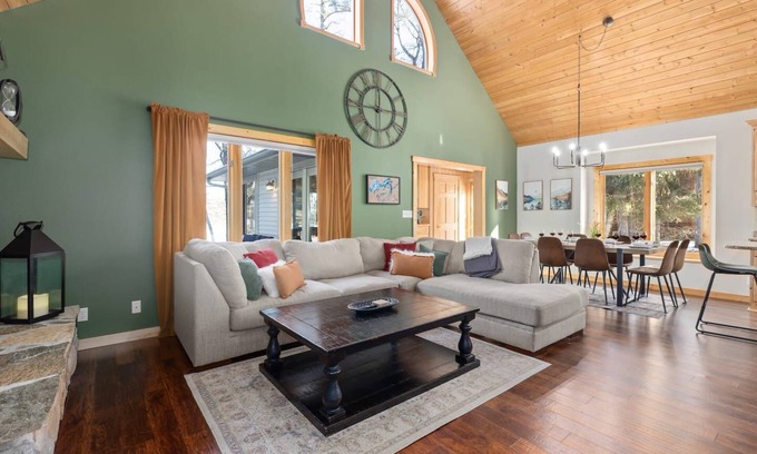 Features a spacious gorgeous green couch along with comfy camel accent chair. This is THE best spot to sip your cup of coffee in the morning looking at at the lake. Whether it's colored with the amazing fall leaves, summer sun, or layered with ambient snow, you will truly feel the most relaxed in this serene spot of the house.