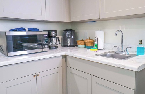 Inside, you'll find a king-size bed that promises restful nights and a queen pull-out sofa for extra guests or lounging. The kitchenette comes with all the essentials: a mini-fridge, microwave, stove, and coffee maker, making it easy to enjoy a meal or snack without leaving your cozy retreat. For longer stays, you’ll appreciate the private laundry room—a lifesaver for keeping everything fresh.