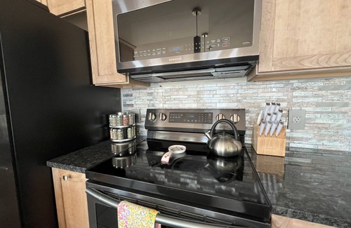 KITCHEN: Fully equipped, cooking basics, dishware & flatware, dishes & utensils for kids, electric stove, microwave, toaster, drip coffee maker, Keurig coffee maker, espresso machine, tea kettle, blender, dishwashers (2), trash bags, paper towels