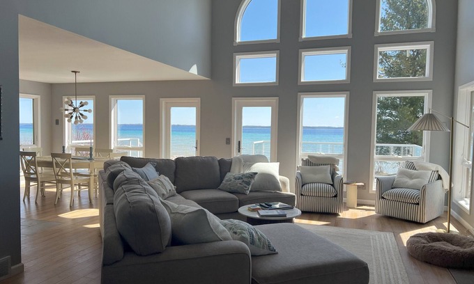 Suttons Bay Getaway is a stunning gem situated on the picturesque West Grand Traverse Bay. Just a stone's throw away from the charming town of Suttons Bay, this lovely, spacious lakefront home treats you to breathtaking views of the bay from the deck, living room, dining room, kitchen, and master bedroom. You’ll only need to take a few steps from the deck to experience the lake's inviting, deep blue waters. With the birds singing and the fresh air all around, you will honestly know this is what a vacation should feel like. From the moment you arrive, a wave of relaxation washes over you. Get ready to be mesmerized by the stunning colors as the sunrise paints the sky across the bay. Gather your whole group around the fire pit for fun, laughter, and delicious s'mores under the enchanting moonlight in the evenings.