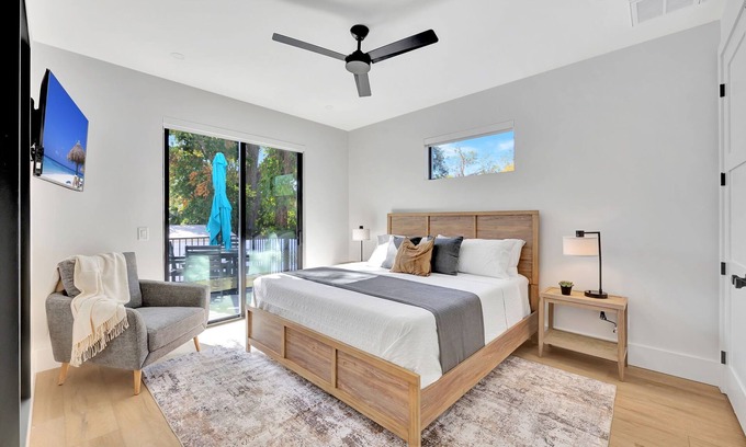 *BR1- king bed with sliding doors to the back patio and fenced yard, with outdoor seating and grill