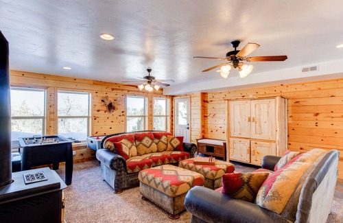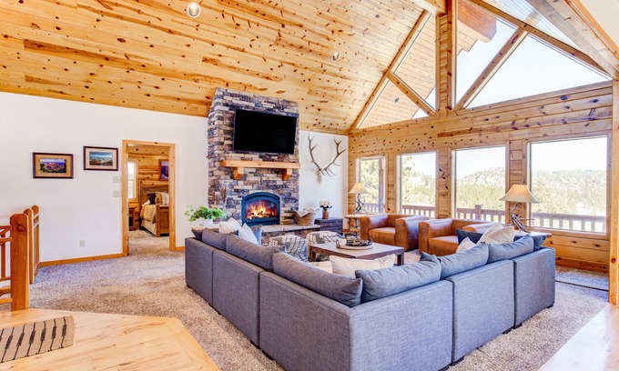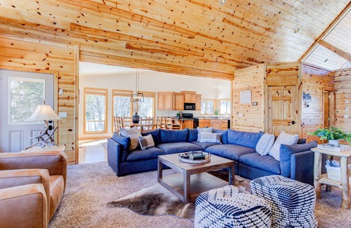 This charming rambler-style cabin has two large living spaces;