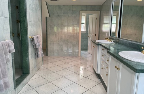 There are two Primary Suites. One on the first floor with a king bed, TV, full bath with soaking tub & pedestal sink. Upstairs is a second Primary Suite also with a King bed, stunning views, and an enormous bathroom fit for royalty, complete with a whirlpool tub, double vanity sink, and ample closet space.