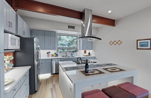 The fully equipped kitchen features a large center island with a 30" electric stove/oven. Quartz countertops with silver specks sparkle under natural light. You’ll have everything you need to prepare the perfect home-cooked meal — including cookware, utensils, pots and pans, dishes, glassware, and small appliances like a coffee maker and blender. Whether you're whipping up breakfast, grilling on the patio, or hosting a cozy dinner in, this kitchen is ready for it all.