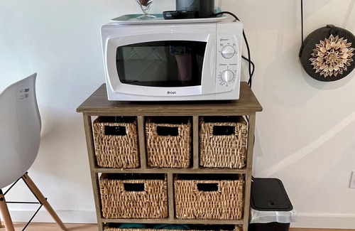 The kitchenette is equipped with a stovetop and a refrigerator, as well as a coffee maker, an electric kettle, and a microwave. Bathroom amenities include a hair dryer, towels, and toilet paper. Other amenities include bed sheets, housekeeping, and air conditioning.