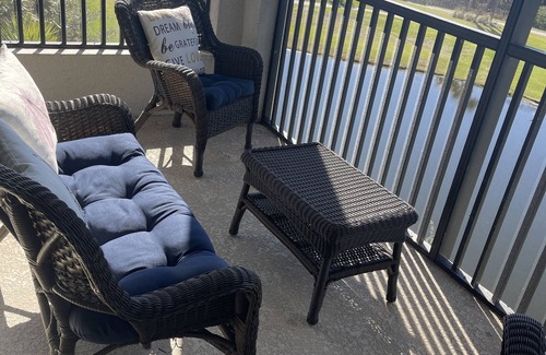 2 Bedrooms 2 bath. King bed in master with TV and queen in guest room,washer/dryer in unit,elevator in building if needed. The top floor view is 4th floor overlooking the golf course and a nice pond. Screened in Lanai, living room will have a TV 65” HD smart tv.