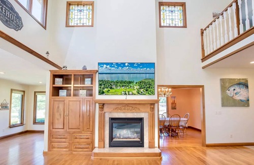 Bring the whole family to this great place with lots of room for fun. 1 King bed, 2 Queen beds, 4 twin beds & a super comfy couch. Full access to the boat dock included! Natural gas grill in the back, extra extra large yard and the view! Bring the entire family!