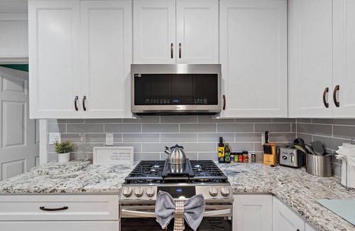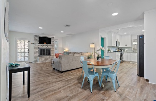 ✔️ The Place: Our place has three bedrooms and three full bathrooms, offering ample space for up to 8 guests. The master bedroom has a king bed, en-suite bathroom and large walk-in closet. The second bedroom offers a queen bed and private access to the outdoor patio. The third bedroom has an additional queen bed as well as a bunk bed (full bottom & twin top). There is also a pack and play travel crib. A shared bathroom is located between the two secondary bedrooms. Pool towels and extra linens can be found in the hallway closet, across from this bathroom. There is also a full bathroom with a large walk-in shower located in the game room. This room also includes a washer & dryer, foosball table, Bluetooth speaker and games. Featuring high-end appliances and a natural gas stove, the freshly remodeled kitchen offers all the essentials you could need. If you can’t find it, just let us know! We are almost always happy to provide anything we may have overlooked.