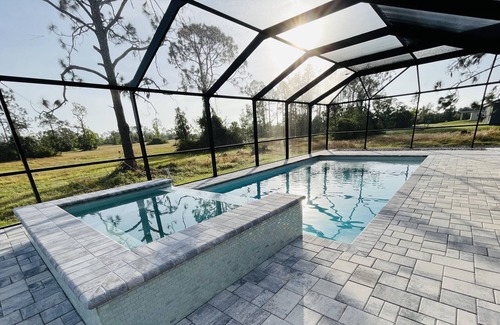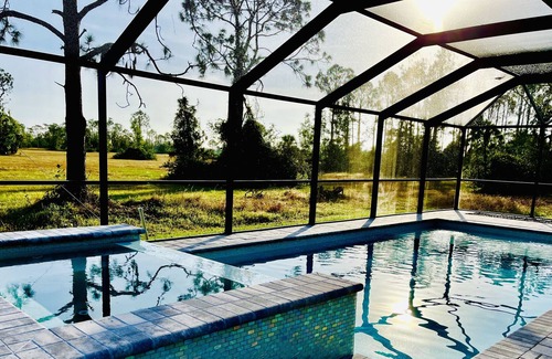 Modern , open space house with brand new salt water heated pool , waterfall spa and LED lighting . The view from your own private oversized screened enclosure is absolutely breathtaking overlooking gorgeous Florida nature preserves. The house is located in a very quiet, peaceful neighborhood where you and your family will feel welcome and safe.
