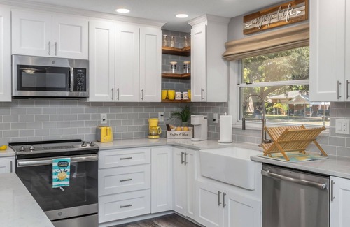 Enjoy your host provided local ground organic coffee or organic tea at our large kitchen island. The kitchen is fully updated with all modern conveniences and a fun summer vibe. The open layout is perfect for family gatherings and dining. Enjoy family movie night on the big screen TV, while relaxing on the large sofas in the living room, or take out some provided playing cards and board games for a little friendly competition! The kids can even have a fun sleepover in the living area with the full size pullout couch, and the two day beds in the connected four seasons room!