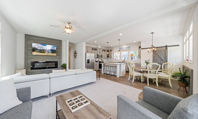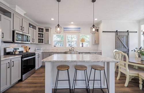 Entering the home, you are greeted with a large open floor plan, with tall ceilings, premium furnishings and bright airy windows offering lake views. There is a spacious well-equipped Kitchen and dining room seating for 6. There are 3 bedrooms and 2 full bathrooms. The primary bedroom is a king size bed with en suite bath. The soaking Tub is great for relaxing and sipping some local wine. The second bedroom includes a queen sized bed and large closet. The 3rd bedroom includes double sized bunk beds to sleep all the kids. The second bathroom is great for larger groups with a full tub/shower.