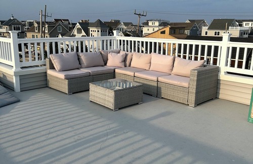 Beautiful new beach house just one short block to a PRIVATE beach! 10 beach tags included. Rooftop deck with beautiful sunrise and sunset views. 4 bedrooms, 3 1/2 bath plus outdoor shower. Elevator from ground floor entry to 1st floor living space and 2nd floor bedrooms. Master bedroom with private balcony. Two more balconies off bedrooms/sitting areas plus a spacious deck off kitchen/living area. Smart TV in each bedroom. First floor sitting room with desk and wireless printer in case you need to 'work from home'. Secured Wi-Fi accessible on all levels including the rooftop! Kitchen with gas stove, beverage/wine fridge and stand-alone ice maker! Full house generator. @deauvillebeachnj