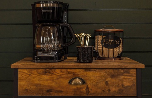 - Fully stocked coffee bar: Drip Coffee Maker, Coffee Grounds, creamer, sugar