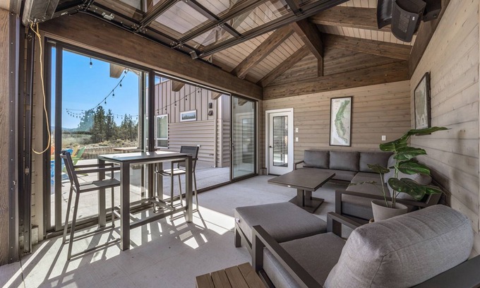 Find morning solitude with a cup of joe in the heated enclosed patio while you take in the surrounding views, or welcome the brisk dawn air by opening the large garage-style door. After a day exploring the wonders of Central Oregon, return home and unwind to soothing sounds of the river while sharing stories around the fire pit.