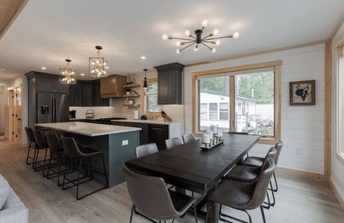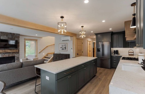 The main level features a handy mudroom to keep organized, Queen bedroom and bath with shower, laundry room, modern kitchen with eat in expansive granite island and brass fixtures, long dining table with views and a gas fireplace in the living room.