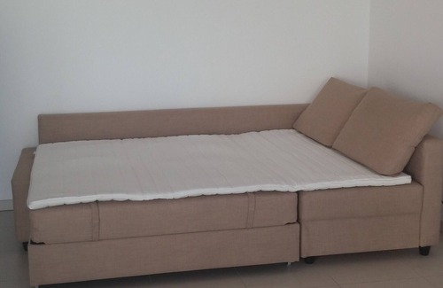 On the ground floor, there is a living room-kitchen with a sofa bed (with a mattress topper for optimal comfort), an equipped kitchen (induction hob, extractor, oven, fridge). freezer) and a private garden of 74m2.