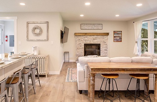 Inside Aimee's Hideaway, you'll find a well-lit, open concept living/dining/kitchen area featuring a cozy electric fireplace to warm up those chilly evenings, a 50" smart TV, Wi-Fi internet access, and a comfy sectional. There is a library of kid-friendly and beach-related books, board games, and DVDs for you, your family, and your friends to enjoy.