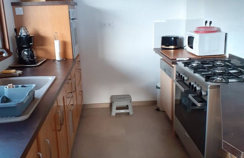 Open fitted kitchen: oven + microwave, gas hob, toaster, coffee maker, kettle, dishwasher, fridge = freezer.