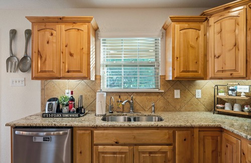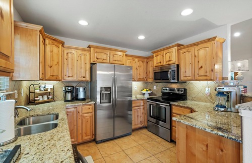 The kitchen is built for real cooking, not just snacking — with full-size appliances, granite countertops, and everything from a Keurig to a rice cooker to a Margaritaville blender. There’s plenty of space to sit down and share a meal, and even more room to relax in the cozy living area with leather seating, a large Smart TV, and a selection of games and entertainment options. Fast Wi-Fi makes it easy to work remotely, stream, or stay in touch with home.