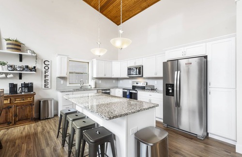 Snapper Cove has a large open living area on the main level with a large floor to ceiling stone fireplace (electric), tongue and groove wood ceiling, a 10 foot dining table, large coffee bar, fully stocked kitchen with plenty of plates, glasses and silverware for your entire group, 70” Smart TV, a game corner with gumball machine to keep the kids busy and amazing views of Lake Taneycomo. Off the living area is a large deck with a grill, plenty of outdoor seating and more views of Lake Taneycomo.